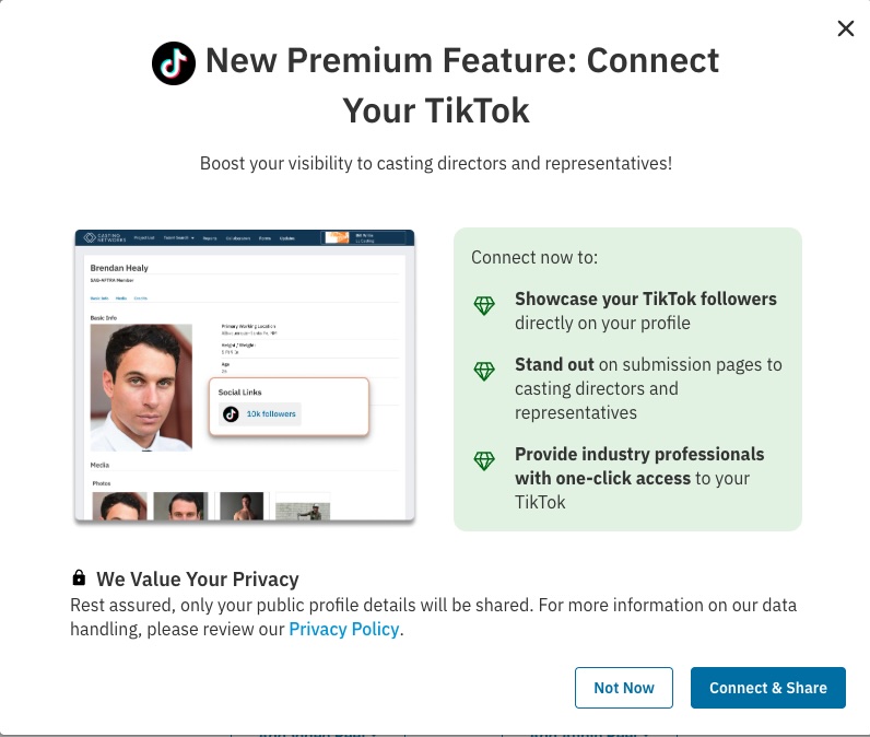 You’ll be presented with a popup from TikTok to login and give permission to link your account to Casting Networks.
