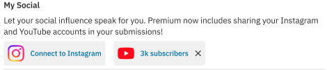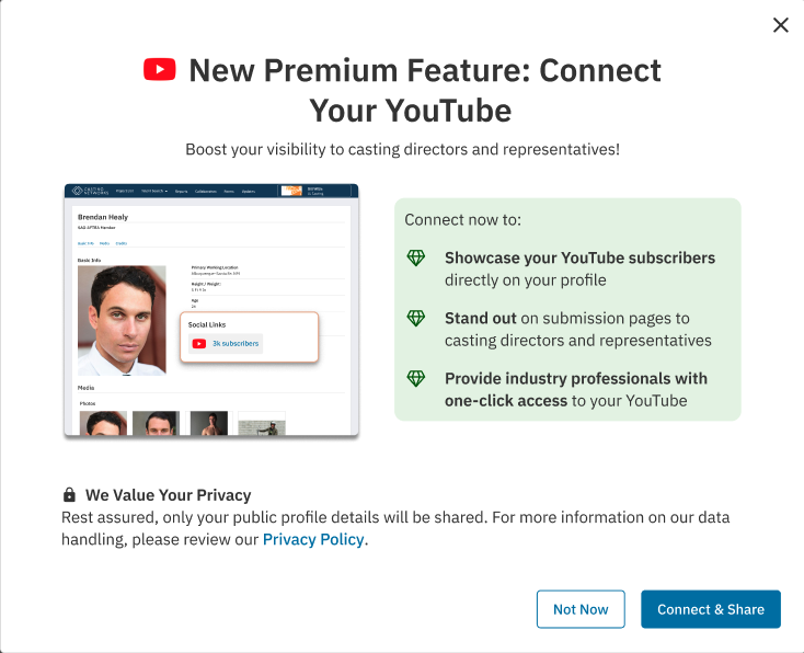 Premium Members on Casting Networks can now enhance their profiles by linking their social media accounts. This functionality currently exists for Instagram and YouTube.
