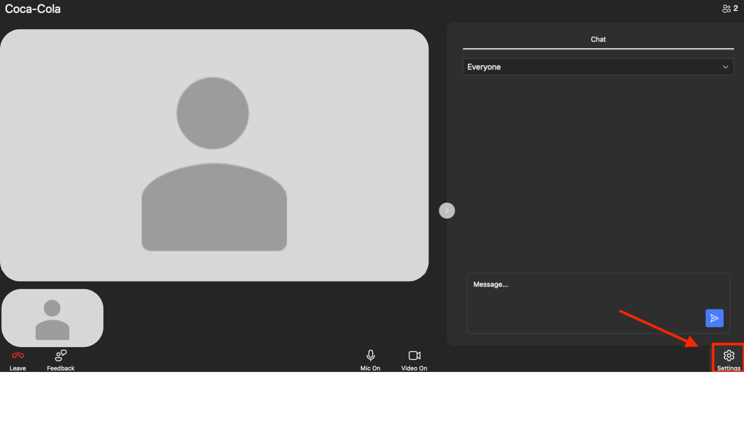 After Joining: If you need to adjust your sources after joining the session, click the Settings option in the lower right-hand corner of the screen. From here, you can adjust your Audio and Video sources and check your Connection strength.