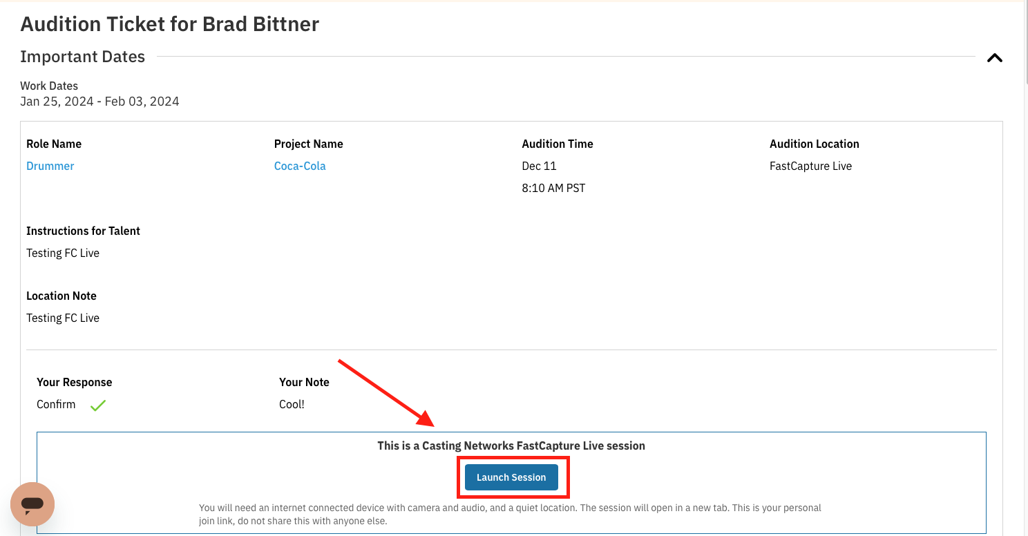 You will receive an audition request from the casting director, which will appear in the Your Alerts section of your account. Within the request, the alert will specify that it is a FastCapture Live Session.
