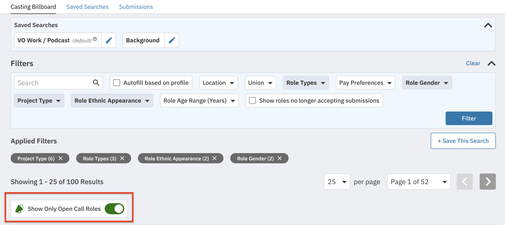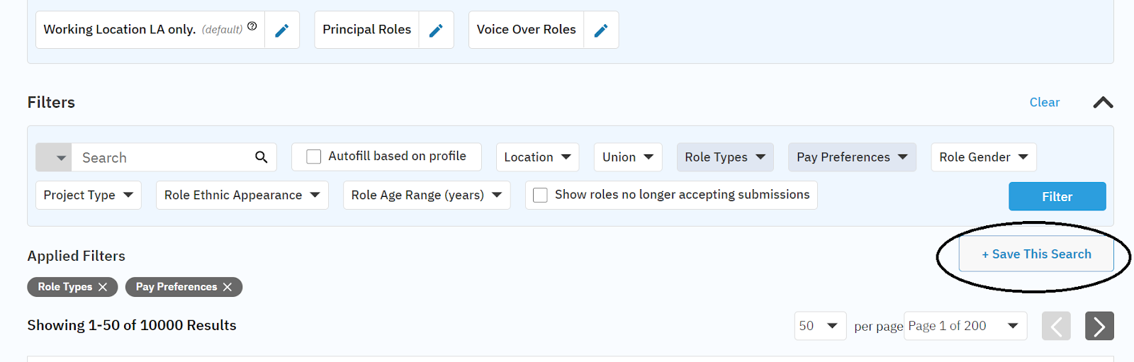 The filters on Casting Billboard® help show you roles that are a good fit. By default, your Casting Billboard® is filtered by your age range, gender appearance, and location. You can further filter by project type, role type, and more. Saving your search filters allows you to easily find roles with your set preferences every time.