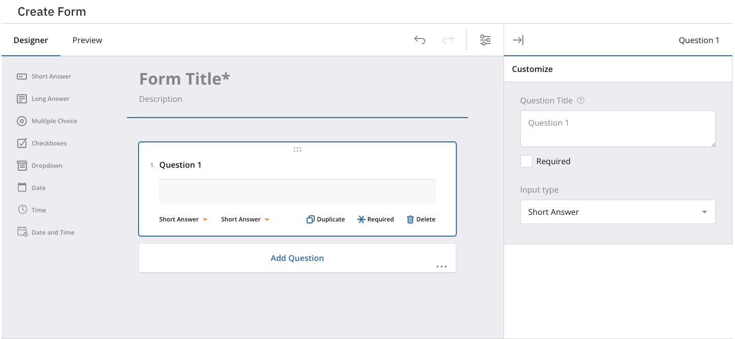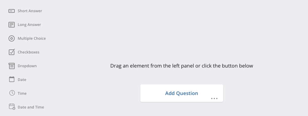 You can either drag one of the question elements from the left panel or click the “Add Question” button to get started.