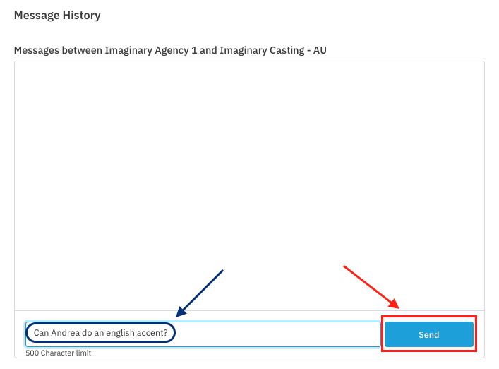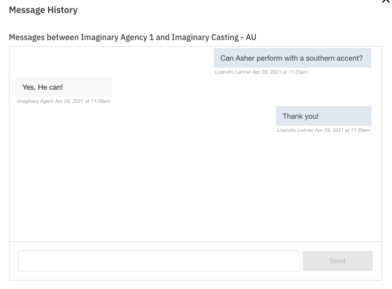 Enter your message and press Send when ready to send to the talent's representative.