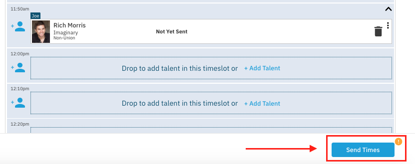 Click Send Times to notify talent or their representatives of their scheduled appointment.