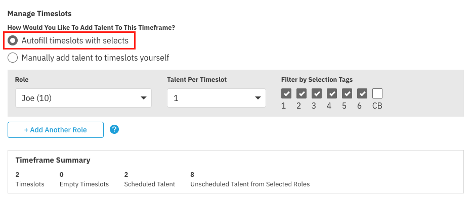 Once a timeframe has been added to your schedule, you have two ways to place talent into timeslots: