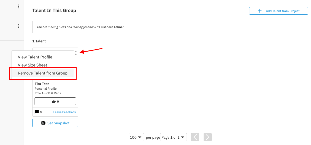 Under the Talent in the Group section (right-hand side), select the menu button (three dots) to the right of the talent's photo.