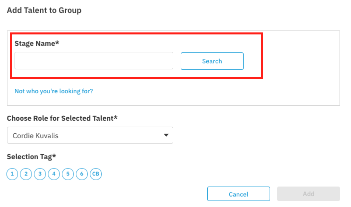 Under Stage Name, type in the stage name of the talent you're searching for. Then click Search.