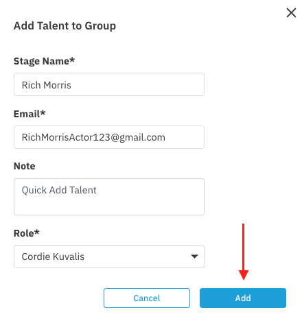 Enter the talent's Stage Name, Email address, any notes you'd like to add, and the role you're adding the talent to.