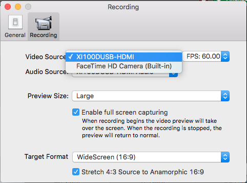 Configure FastCapture® to use the desired devices by clicking FastCapture® in the upper left-hand corner of the screen, then selecting Preferences. Choose the Recording tab and the appropriate video and audio sources.