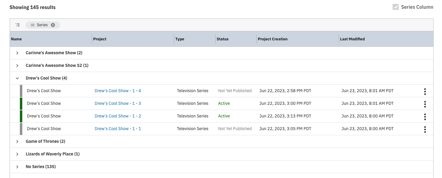 Your projects will now be grouped by series name. You can click the down arrow next to a series name to see all the episodes within that series.