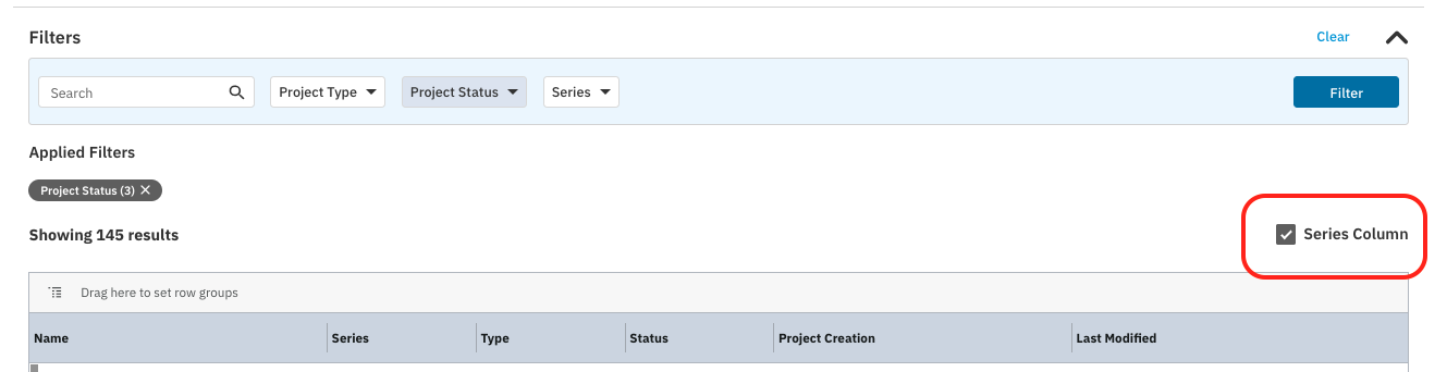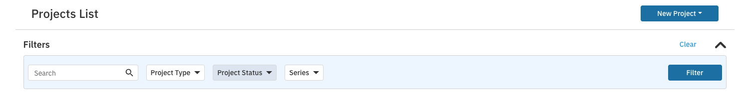 At the top of the page, you will see a Filters feature. This allows you to filter your view by Project Type, Project Status, and Series.