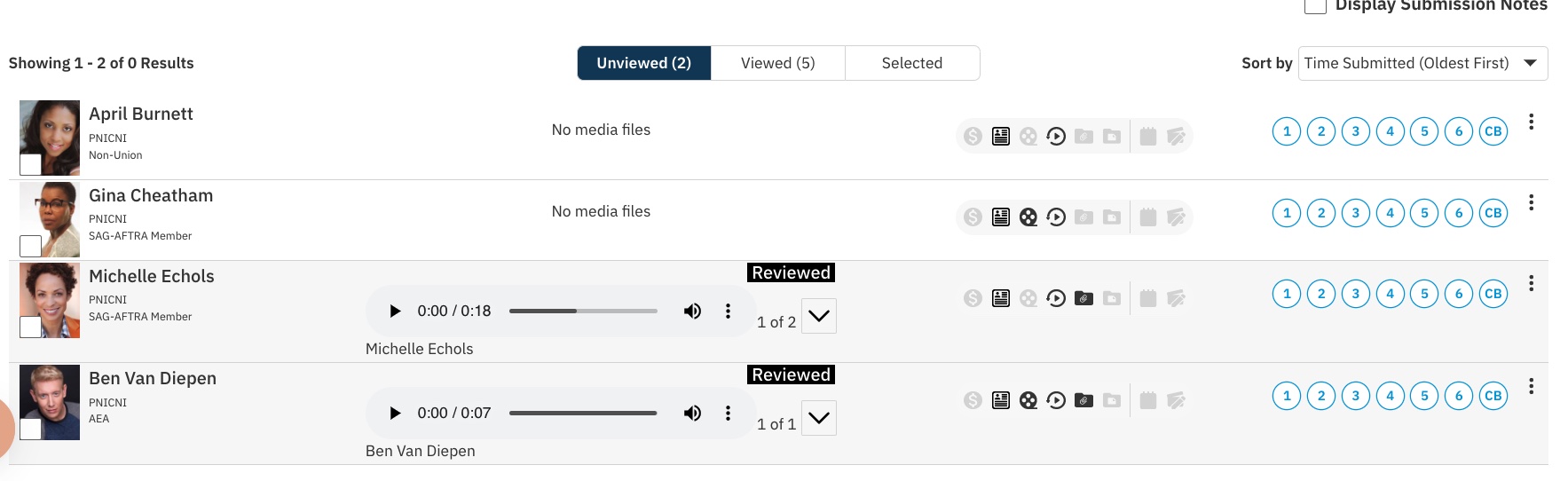 When reviewing your role submissions, you can listen to audio files attached without having to open the profiles.