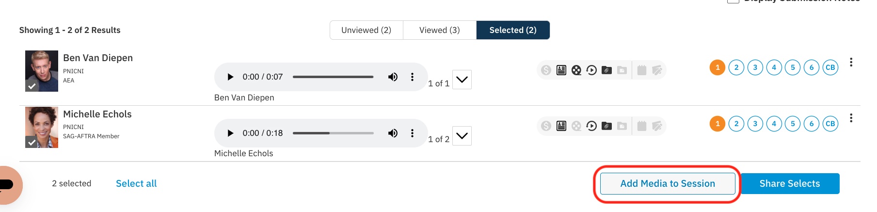 You can either share selects OR add the talent and media directly to a Session.
