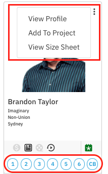 You can View Profile, Add to Project and/or View Size Sheet. To add the talent to your Selects for the role you are in, make a selection by choosing 1 - 6 or CB (callback).