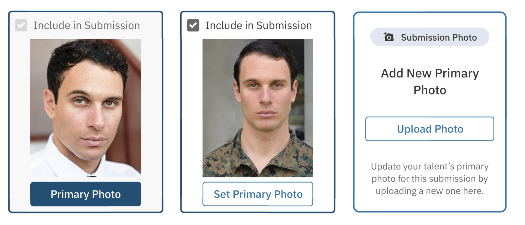 You can either choose an existing photo from your talent's profile to be the primary photo for the submission, or you can upload a brand new one just for this submission. 📸