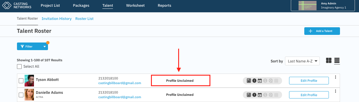 If you are viewing talent profiles in Talent Roster view, you may notice a message next to some profiles that reads "Profile Unclaimed."