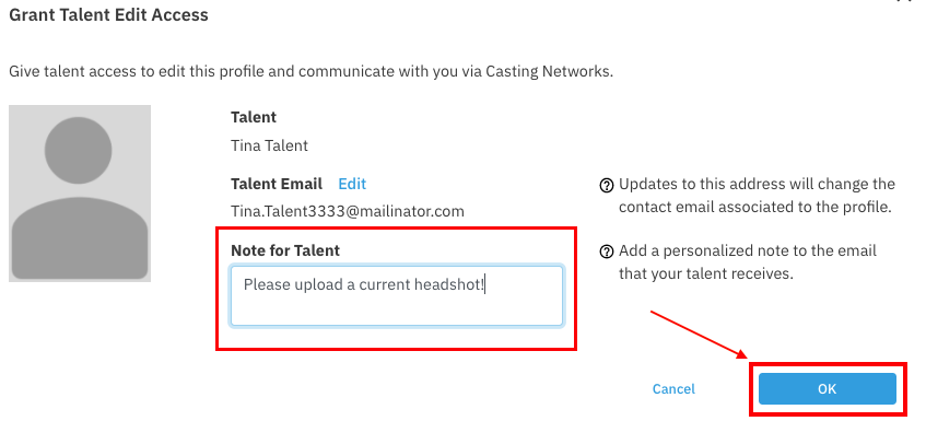 An email will immediately be sent to the talent with instructions on how to access and edit their profile.
