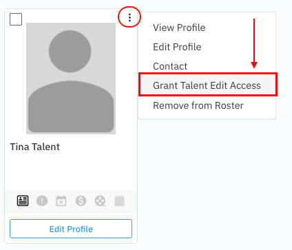 By default, when you create a new profile for a talent on your roster, it is automatically shared with them so they can update and maintain it. However, the Grant Talent Edit Access feature is useful in specific scenarios: