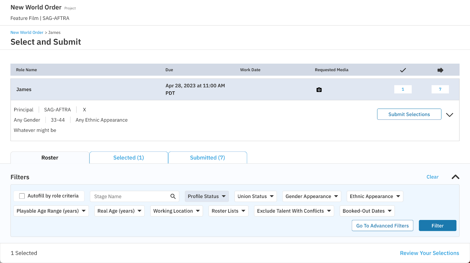 This will bring the representative into the Select and Submit section. This is where they can view more details on the role, Rate Details specific to the Role, Dates and Location information, and Submission information; such as Requested Media type and Media Instructions.