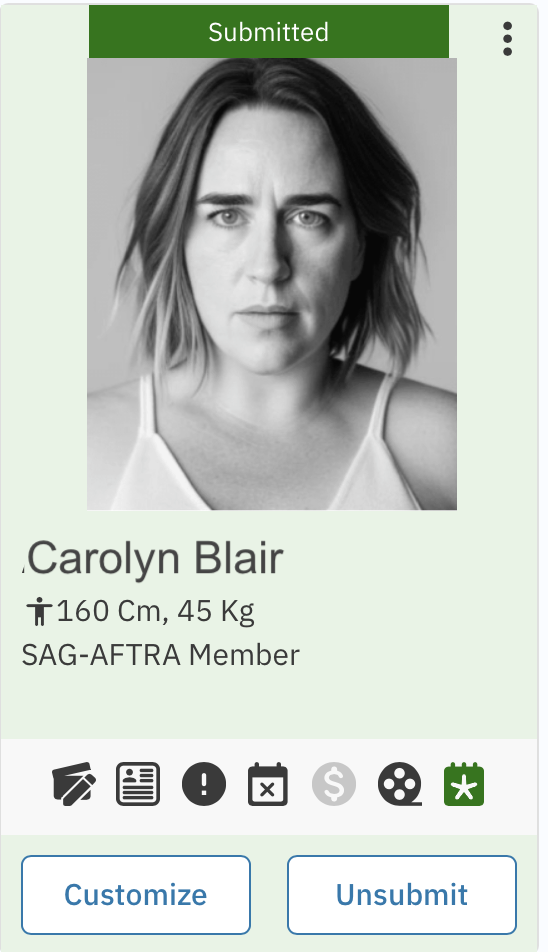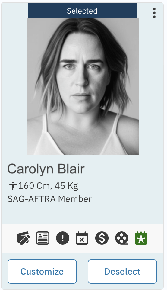 Once a representative has selected talent to Submit, they’ll have the ability to “Customize” each submission before submitting to Casting.