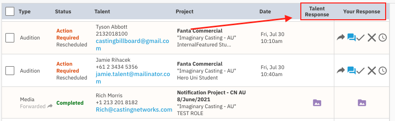 You can keep track of a request’s progress with the Talent Response and Your Response columns, which use icons to show if talent have responded and if you have sent the response to casting.