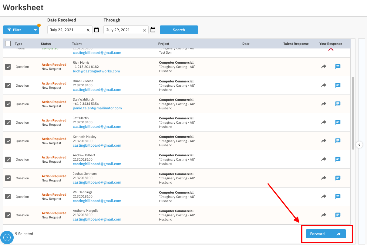 Your Worksheet houses all information for your requests. Each request has a status, letting you know if there is Action Required, a response is Pending from talent or casting, or if it is Completed. When viewing requests by Received Date, the newest request will appear at the top.