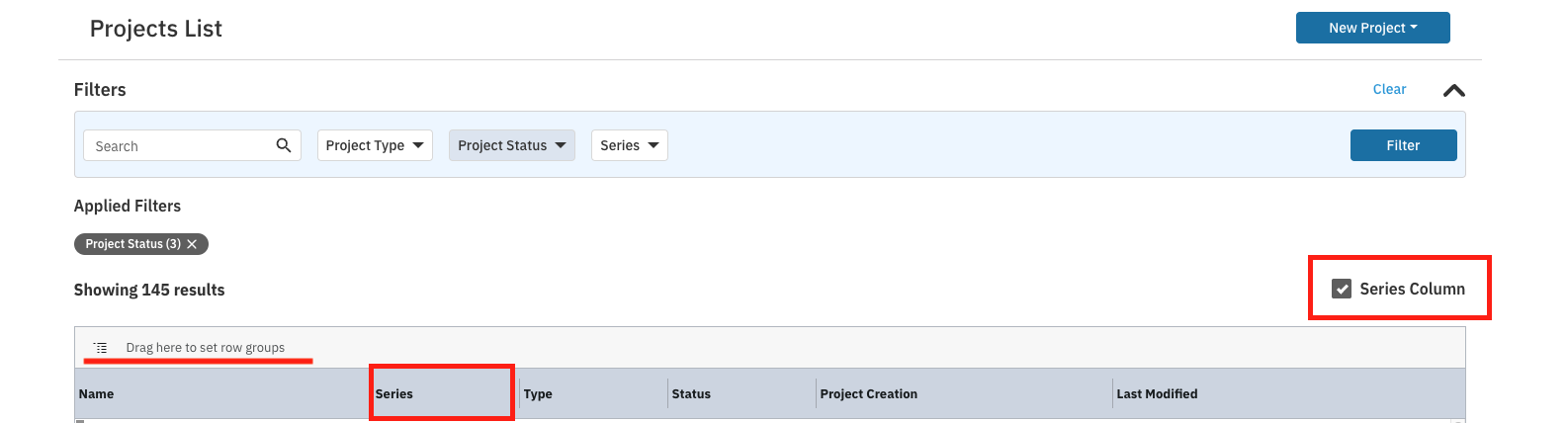 On your Projects List Page, find and check the box that reads "Series Column" on the right-hand side.