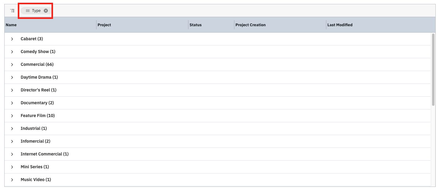 You can drag and drop categories (Series, Type, and Status) to the top to sort your projects by one category at a time.