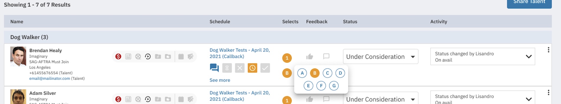 This feature allows you to apply letters (A-G) to talent, providing a flexible way to add a secondary layer of personal organization without conflicting with the existing Number Select workflow.