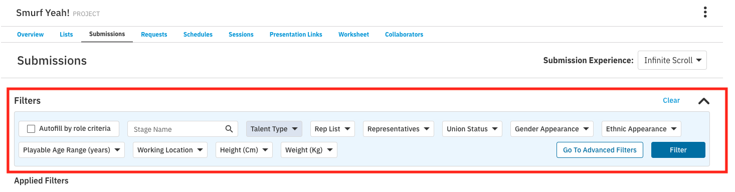 You can choose to auto-fill the filter based on the role information or you can filter the submissions by several common identifiers. You can also choose “Go To Advanced Filters” for additional options including a talent’s appearance, role preferences, and skills and assets.