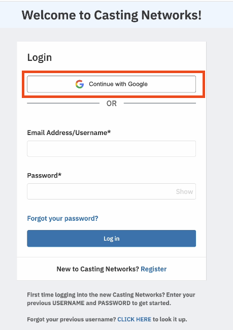 You can use your Google account to log in to Casting Networks quickly and easily. This feature, known as Google Single Sign-On (SSO), saves you from having to manually type your credentials each time.
